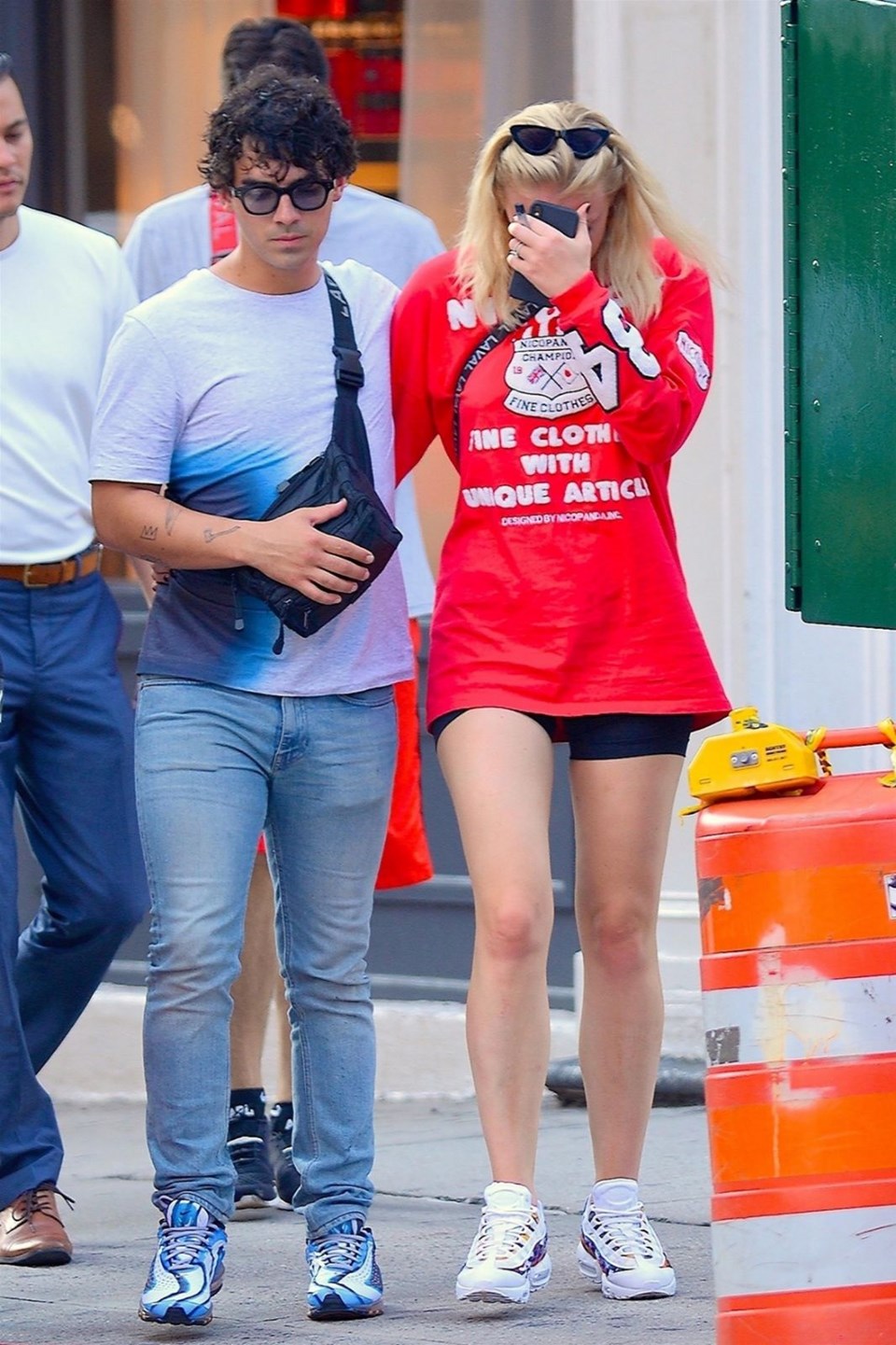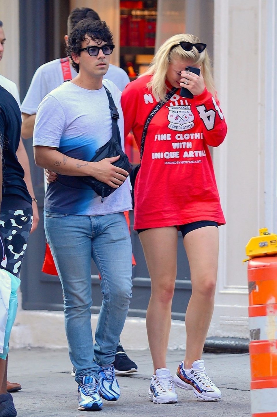 Nişanlısıyla sarılarak yürüyen Turner, eliyle yüzünü kapatmaya çalıştı.
